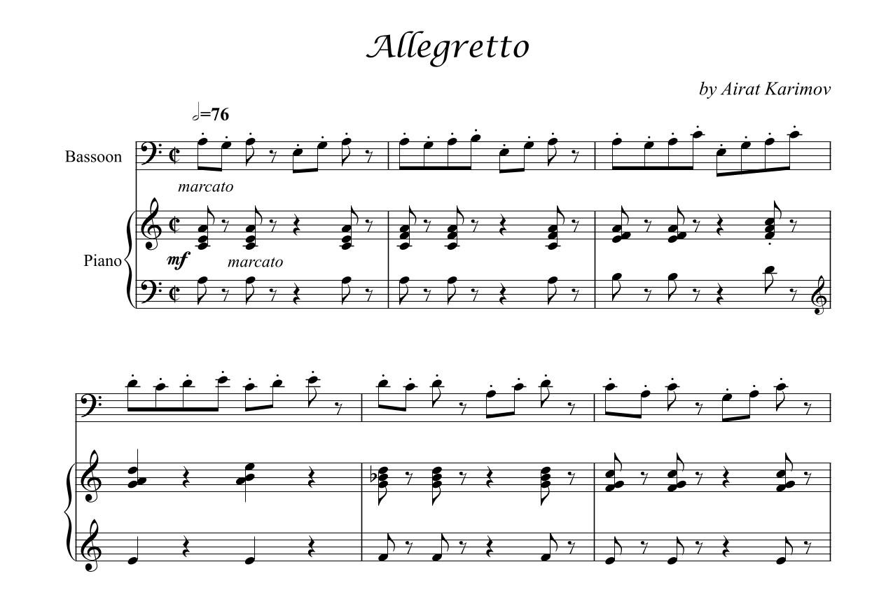“Allegretto” by Airat Karimov is a concert piece for bassoon and piano, written in a lively yet moderate tempo. The music develops through an expansive structure, with a memorable melodic line, syncopated rhythms, and jazz-inspired harmonic turns. A contrasting middle section provides lyrical balance before returning to the vibrant character of the opening.