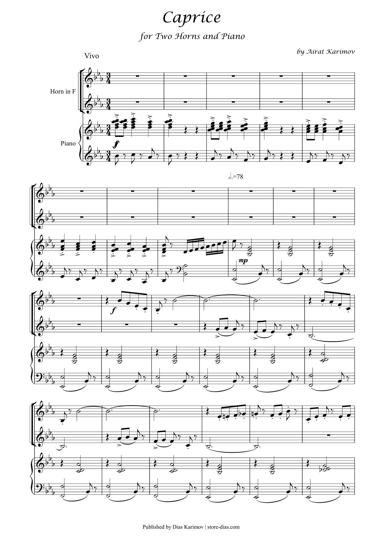 “Caprice” by Airat Karimov is a bright concert piece for two horns and piano. Written in ABA form, it presents a playful, humorous, and graceful main theme, with contrasting transitional episodes that give variety and charm.