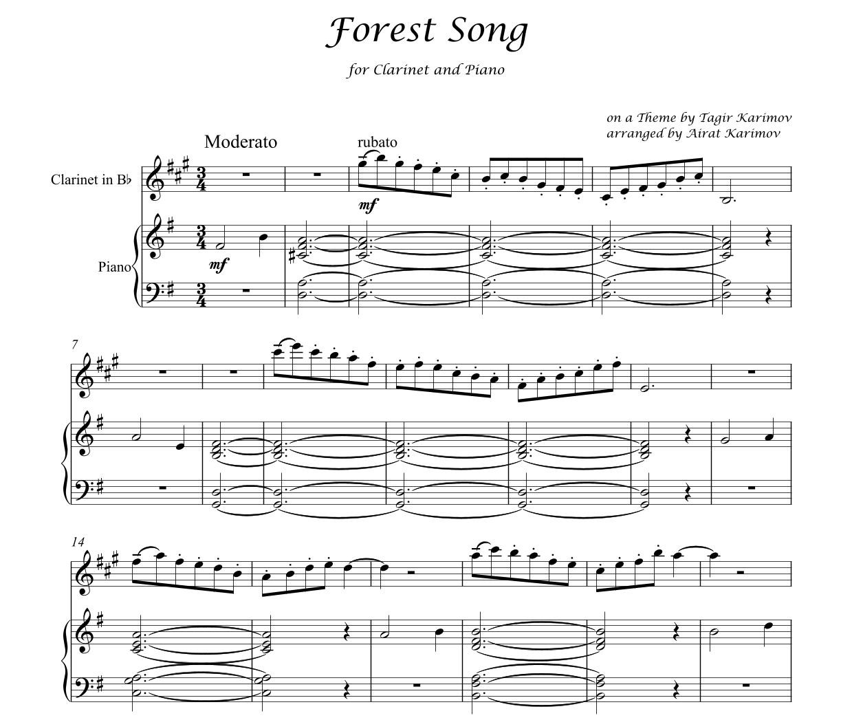 “Forest Song” originates from a lyrical waltz theme by Tagir Karimov, arranged for clarinet and piano by Airat Karimov. The work begins with an introduction that sets the stage for the heartfelt main theme, marked by a romantic spirit, major tonality, and graceful dance movement.