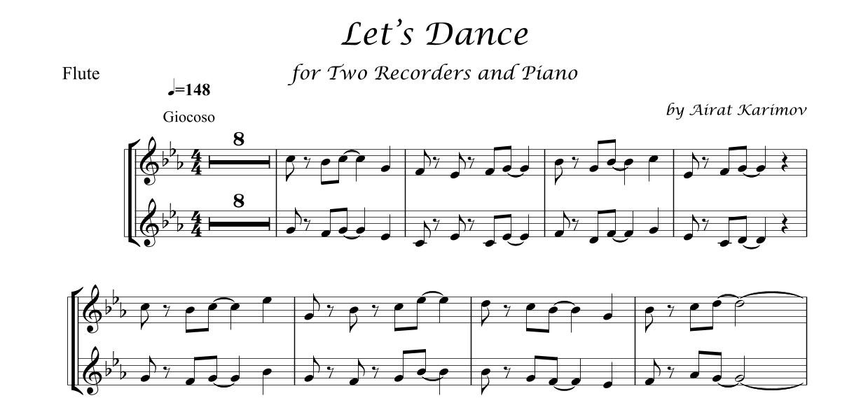 “Let’s Dance” by Airat Karimov is a lively concert piece for two recorders and piano. Written with syncopated jazz-inspired rhythms, it features playful pauses, rhythmic variety, and graceful interplay between the instruments. Both the piano and recorder parts bring out a rich syncopated texture, making the piece dynamic and engaging.