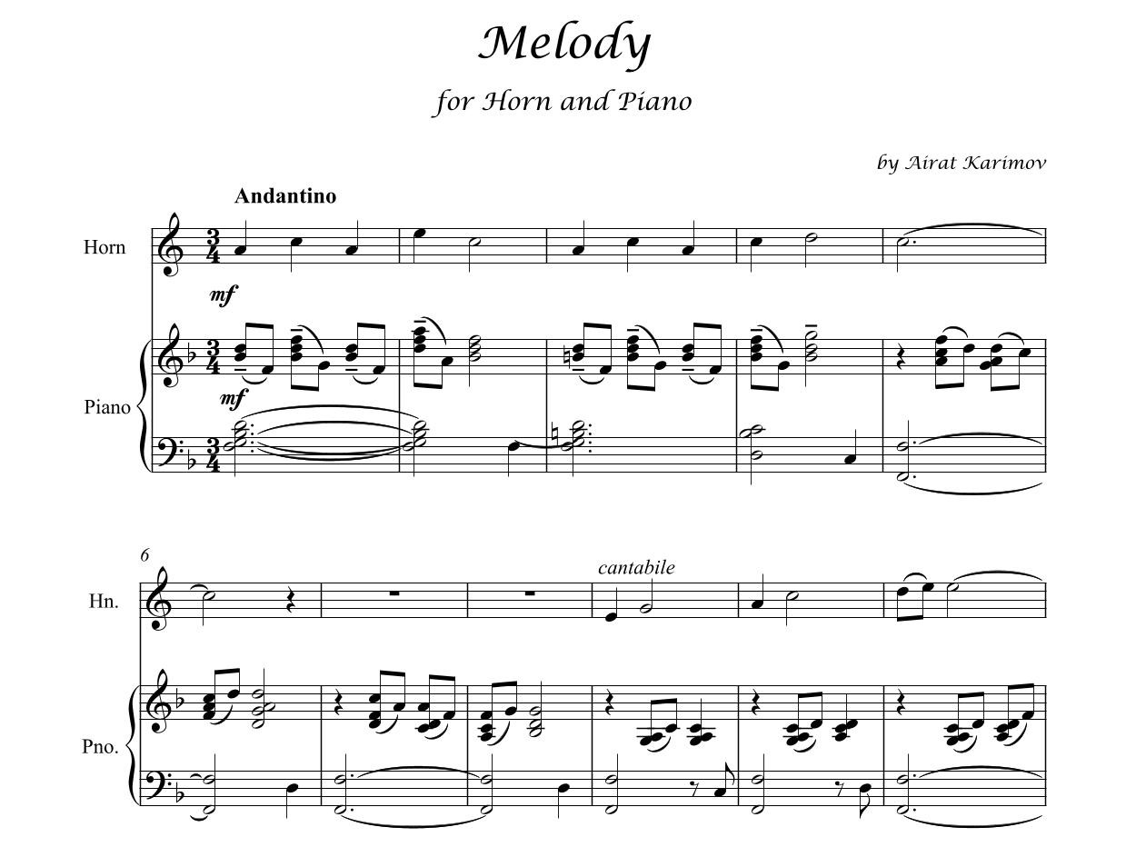 “Melody” by Airat Karimov is a lyrical composition for horn and piano, written in Andantino tempo and 3/4 meter. Expansive in form, the piece develops a singing narrative line that grows toward a broad climax, while maintaining a thoughtful and solemn character.